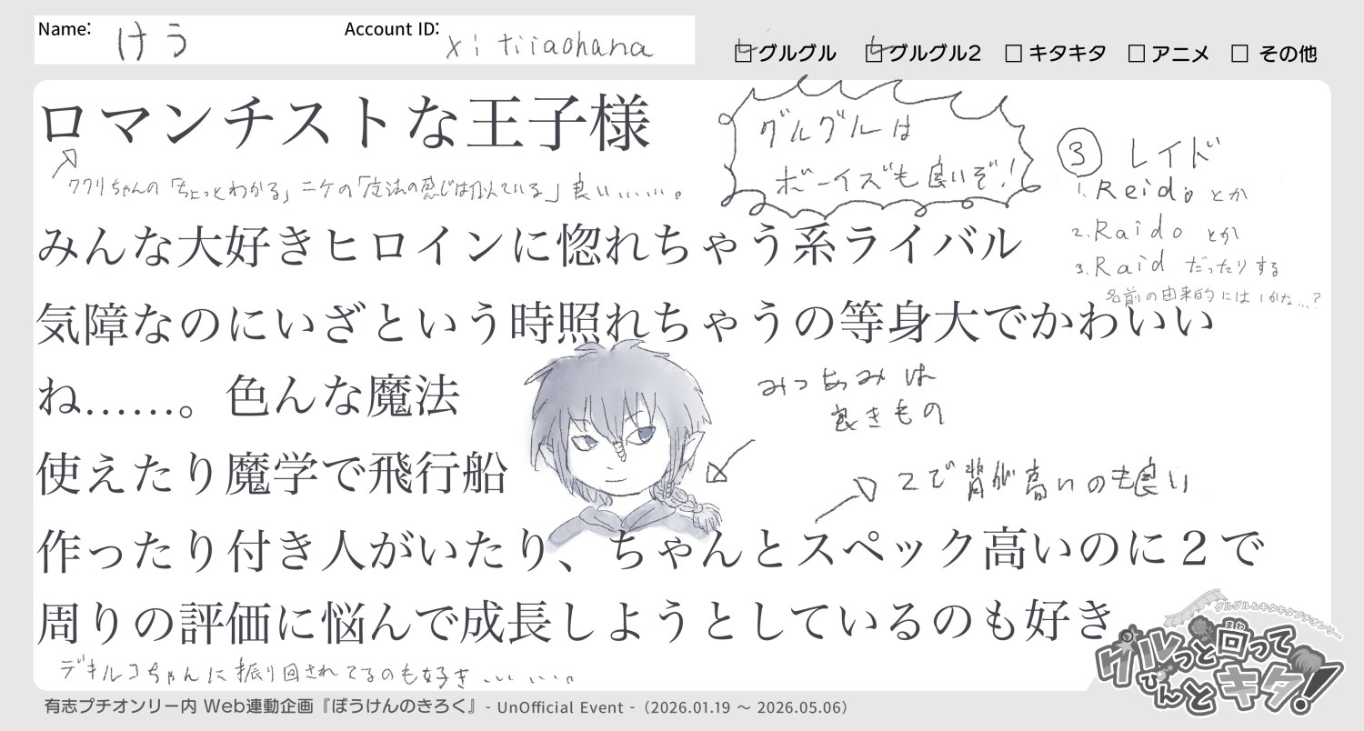 File No.34 【けう】 ぼうけんのきろく 2026.03.16 けう ※記入がなかったら、以下を削除 Xアカウント @tiiaohana ぼうけんのきろく 投稿一覧 へ ※執筆者のみ投稿OK※ ぼうけんのきろくをコピーするコピーしました!