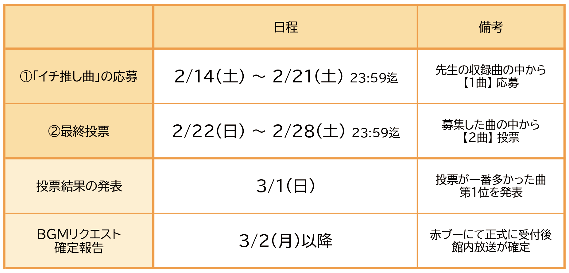 ※曲の確定後、諸事情によりリクエストが困難となった場合は、中止または代替案について改めてお知らせいたします。